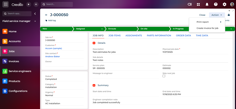 On the Job Summary screen, once a job is marked as Completed, an action button becomes visible that contains a menu option named Create Invoice for Job. Selecting this option automatically generates an invoice for the completed job.