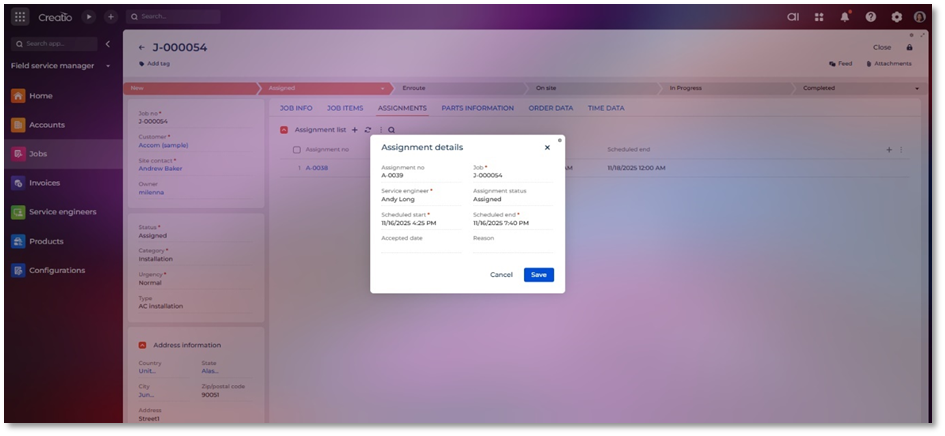 Each assignment is recorded separately and can have its own scheduled start time, end time, and assigned technician. This gives dispatchers full flexibility in planning and ensures all required resources are allocated efficiently.