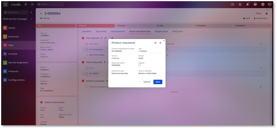 <table data-header-hidden><thead><tr><th width="89" valign="bottom"></th><th width="150" valign="bottom"></th><th valign="bottom"></th></tr></thead><tbody><tr><td valign="bottom"><strong>Sr. No.</strong></td><td valign="bottom"><strong>Field Name</strong></td><td valign="bottom"><strong>Short Description</strong></td></tr><tr><td valign="bottom">1</td><td valign="bottom">Product request number</td><td valign="bottom">A unique auto generated number for product request record.</td></tr><tr><td valign="bottom">2</td><td valign="bottom">Job</td><td valign="bottom">Lookup field to job for which product is consumed.</td></tr><tr><td valign="bottom">3</td><td valign="bottom">Owner</td><td valign="bottom">Creatio user who is managing the request.</td></tr><tr><td valign="bottom">4</td><td valign="bottom">Status</td><td valign="bottom">Status of product requested such as draft, received and submitted.</td></tr><tr><td valign="bottom">5</td><td valign="bottom">Expected Date</td><td valign="bottom">The Expected Date indicates the date by which the requested part is expected to be available, delivered, or ready for use on the job.</td></tr><tr><td valign="bottom">6</td><td valign="bottom">Shipment type</td><td valign="bottom">The Shipment Type field specifies the method or mode of delivery for the requested part.</td></tr><tr><td valign="bottom">7</td><td valign="bottom">Ship to address</td><td valign="bottom">The Ship to Address field specifies the location where the requested part should be delivered. This may be the job site, a technician’s location, a customer address, or a warehouse.</td></tr><tr><td valign="bottom">8</td><td valign="bottom">Closed?</td><td valign="bottom">The Closed field indicates whether the parts request has been fully completed and is no longer active.</td></tr></tbody></table>