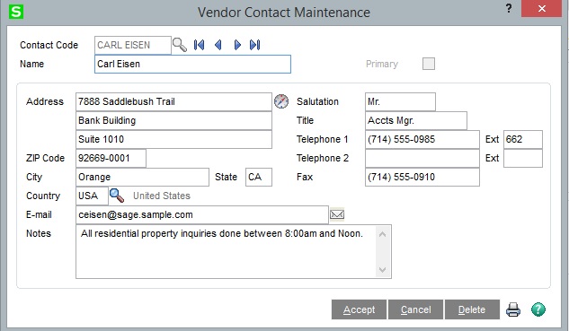 User can create/update below information if “Sync To CRM” checkbox is checked on Vendor maintenance in Sage 100.