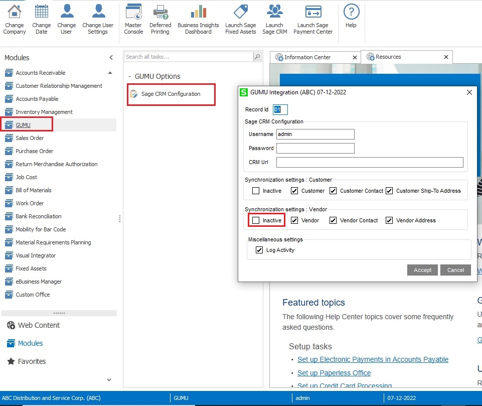 In GUMU™ we have also provided vendor sync feature from Sage 100 to Sage CRM on real-time basis with the click of Vendor maintenance screen accept button. To enable this functionality user will need to fill in the required details and have to uncheck the Inactive checkbox in the Sage 100 GUMU™ module screen. Refer to below image.