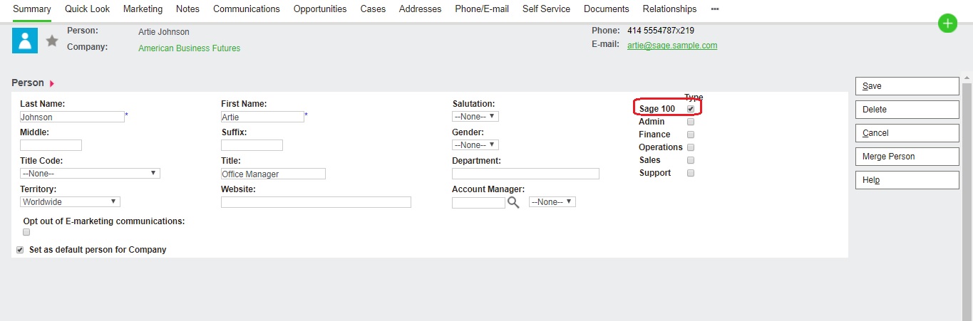 1. Any changes to the person record will be updated in Sage 100 only if the person type is set to Sage 100. Refer the above screen shot.