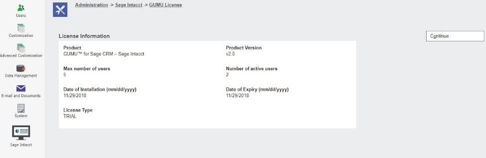 Sage CRM system administrator can see the GUMU™ License key details of the installed GUMU™ Integration version from this page.