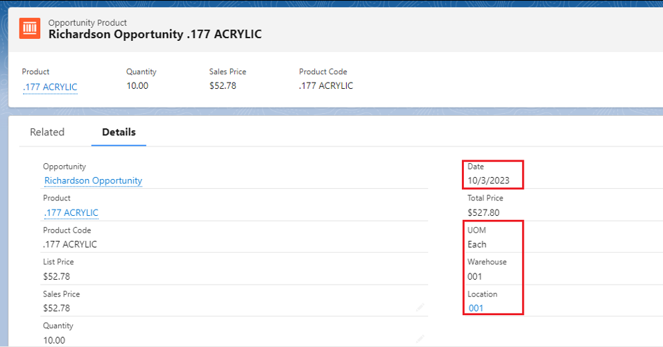 2. Add a product in the Opportunity and provide necessary product details such as quantity, and line description, and in the Opportunity Product layout add details for unit of measure (UOM), warehouse, Due Date, and location.