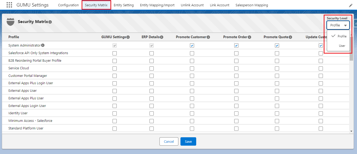 The Security Matrix screen is where you manage access rights for the different integration features. These can be set for specific Salesforce Profiles or by User.