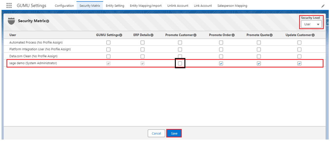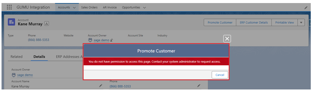 Here is an example: the System Administrator has provided the user, Sage Demo, to access only five Modules (GUMU Settings, ERP Details, Promote Order, Promote Quote, and Update Customer) when the user logs into Salesforce and tries to Promote a Customer, they are not allowed.