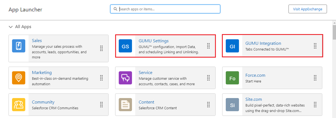 Upon Package installation, 2 GUMU™ applications will appear in the App Launcher of Salesforce