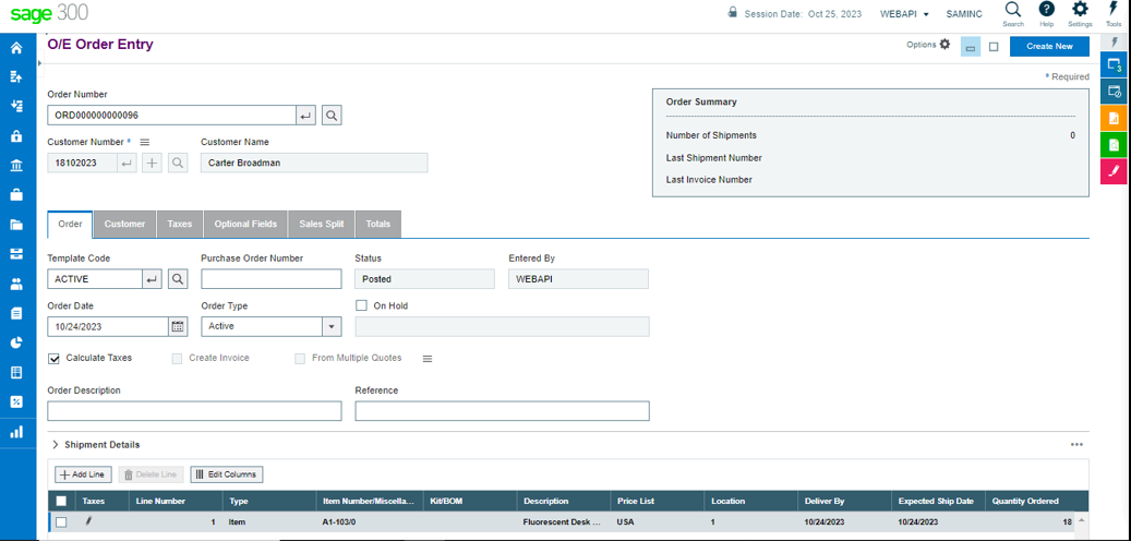 5. To verify whether the Order has been promoted in Sage, navigate to Order Entry and type the ERP order number that has been generated in Salesforce.
