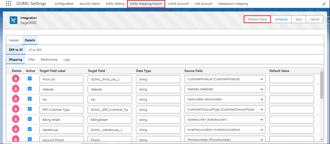 15. Navigate to the **Details** tab and click on the **Mappings** tab, here you can map the Sage fields with Salesforce fields (add additional mappings by clicking on the **Edit** button followed by the **Refresh Fields** button at the top).
