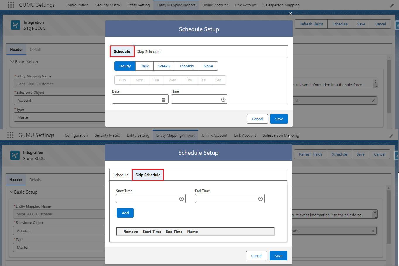 10. To skip a schedule for a specific time, use the **Skip Schedule** tab, enter the start time and end time, and click **Save.**