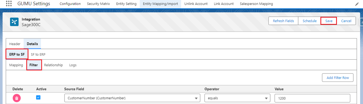Navigate to the **Filter** tab, here you can add a filter to the import routine if you want to import specific data (for example, we have filtered the import routine based on Customer No 1200), and click Save. Select the Active checkbox for all the filter criteria that you want before saving the Entity Sync.