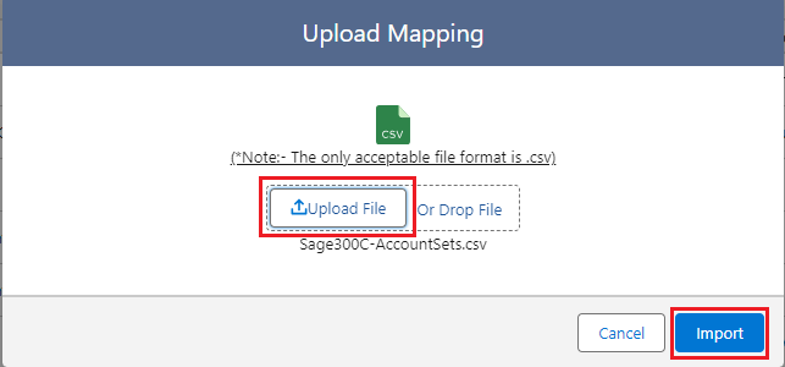 13. The next step is to log in to the other Org (Here we are showcasing in the same Org) and navigate to the **Entity Mapping/Import** tab, click on the **Import Mapping** button, and then click the Upload File button to upload the file.
