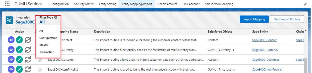 <table><thead><tr><th width="199">Filter</th><th>Description</th></tr></thead><tbody><tr><td>All</td><td>This filter will display all the import routines.</td></tr><tr><td>Configuration</td><td>This filter will display regular imports which are designed to synchronize related data necessary for the master data import or creation process.</td></tr><tr><td>Master</td><td>This filter will display importing details about key entities such as Contacts, Customers, and Products.</td></tr><tr><td>Transaction</td><td>This filter will display importing details of financial or business activities.</td></tr></tbody></table>