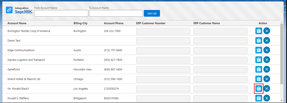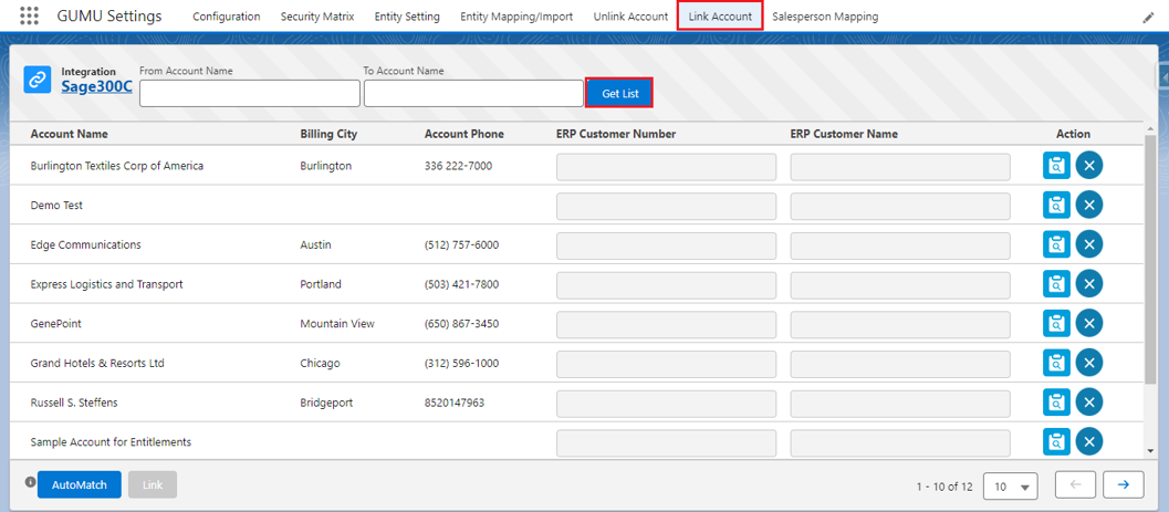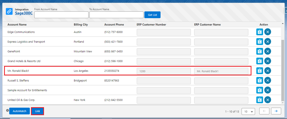 <table><thead><tr><th width="244">Filter</th><th>Detail</th></tr></thead><tbody><tr><td>From Account Name</td><td>Provide the From Account Name from Salesforce (Start Name) to get the list of Salesforce Accounts</td></tr><tr><td>To Account Name</td><td>Provide To Account Name from Salesforce (End Name) to get the list of Salesforce Accounts</td></tr><tr><td>Integration</td><td>Specify the configured Sage ERP Integration to get the ERP Customers List and apply the <strong>Auto Match</strong> function</td></tr><tr><td>Link Matching Criteria</td><td>Select the Link Matching Criteria for matching Salesforce Accounts with Sage Customers (e.g., Customer Name)</td></tr></tbody></table>
