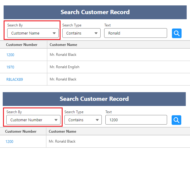 4. Users can now search by Customer Number and Customer Name. Click on the Customer Number (1200).