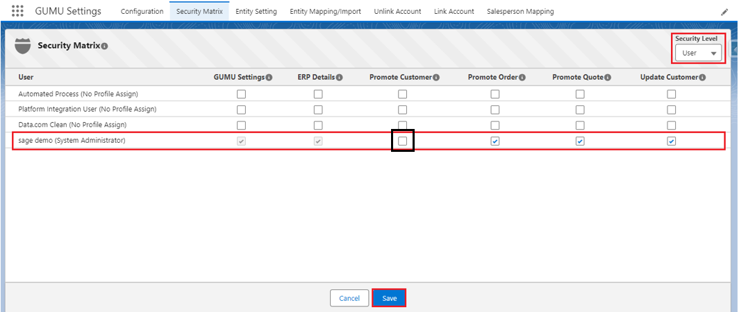3. Here is an example: the System Administrator has provided the user, ***Sage Demo*****,** to access only five Modules (GUMU Settings, ERP Details, Promote Order, Promote Quote, and Update Customer) when the user logs into Salesforce and tries to Promote a Customer, they are not allowed