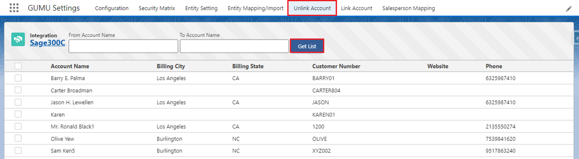 2. Click the **Get List** button and the list of linked Accounts/Customers will be populated in the grid.