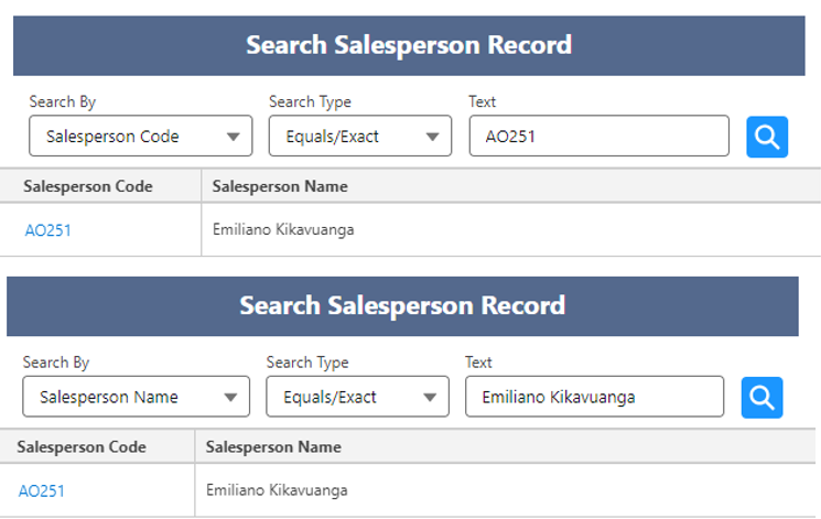 3. Select the Salesperson from the Search Salesperson Record screen (you can search the Salesperson based on Name or Code), and click the **Salesperson Code** to select.