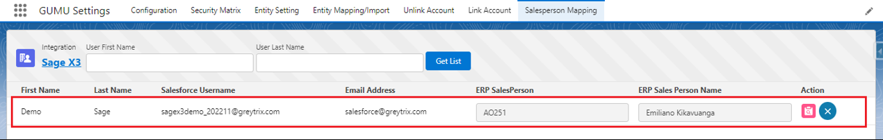 The Salesperson Mapping screen allows you to link a Salesperson in Sage to a Salesforce User, so that the linked Salesperson will be automatically set as the default Salesperson for that specific Salesforce user.