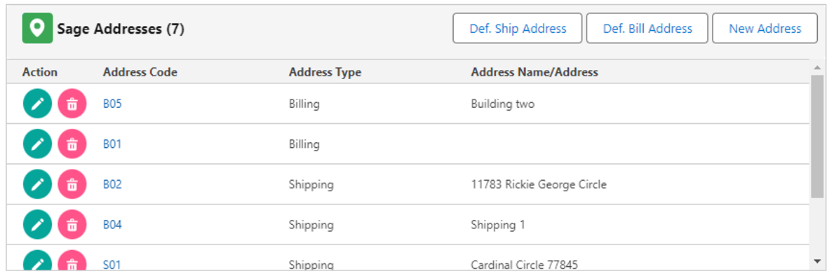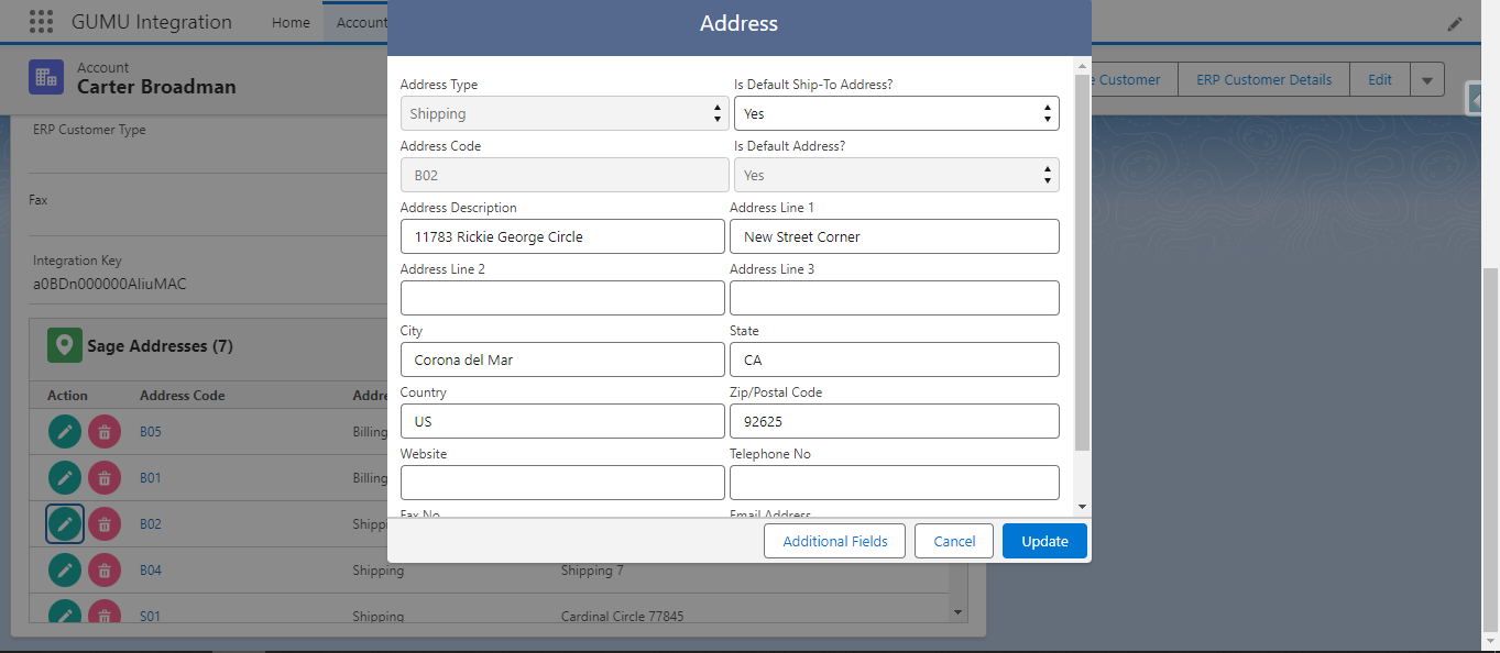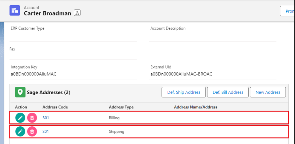 2. Once completed with promoting the Account, then it gets automatically promoted to Sage X3. As shown in the below image B01 and S01 are the promoted Addresses.