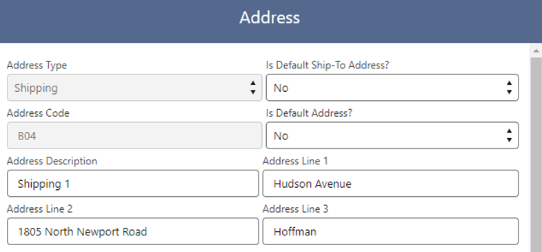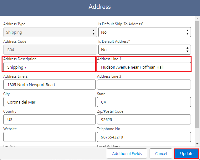 4. Choose the Address Type (Shipping or Billing) from the dropdown menu, ensuring that you change the Address Code to avoid duplication. Complete all the necessary details. In the image above, multiple Shipping and Billing Addresses have been created as examples.